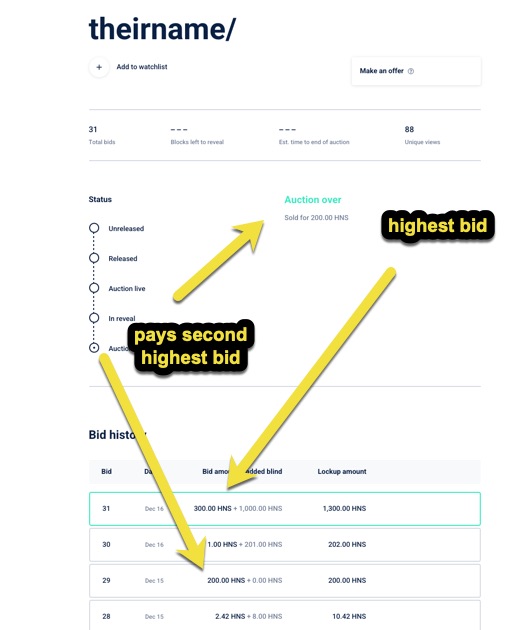 So in theirname/ example, Johnny got the domain “theirname/“ added to his Namebase account, and a 100HNS credit (the 300 - 200 difference in bids).