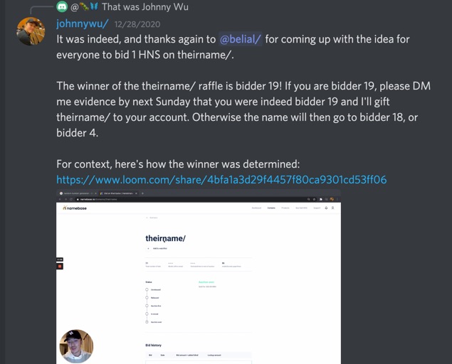 Discussing in the Discord Namer Community by Namebase, Johnny and others said - let’s all bid 1 on it and then he will randomly select the winner (assuming he won - which he did).
