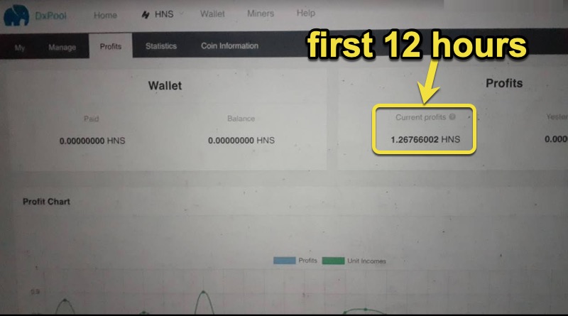 Well - it has been about 12 hours since we started and we have earned 1.5 HNS. At the current price of HNS via Coingecko that is 1.5 * 0.098 USD = 0.147 USD - or rounding up - 15 US cents for a half day.