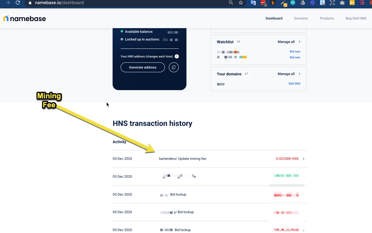 Note, there was a mining fee of approximately 0.02 HNS that Namebase debited from my balance for this update.