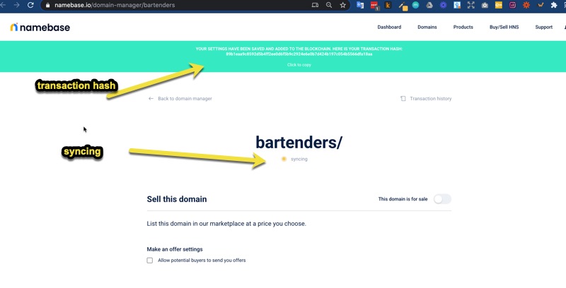 It will give you a success notification and a blockchain transaction ID - as it is now “mining” to update your Handshake TLD’s name server records.